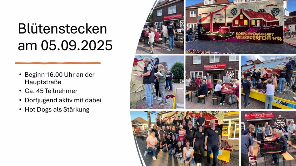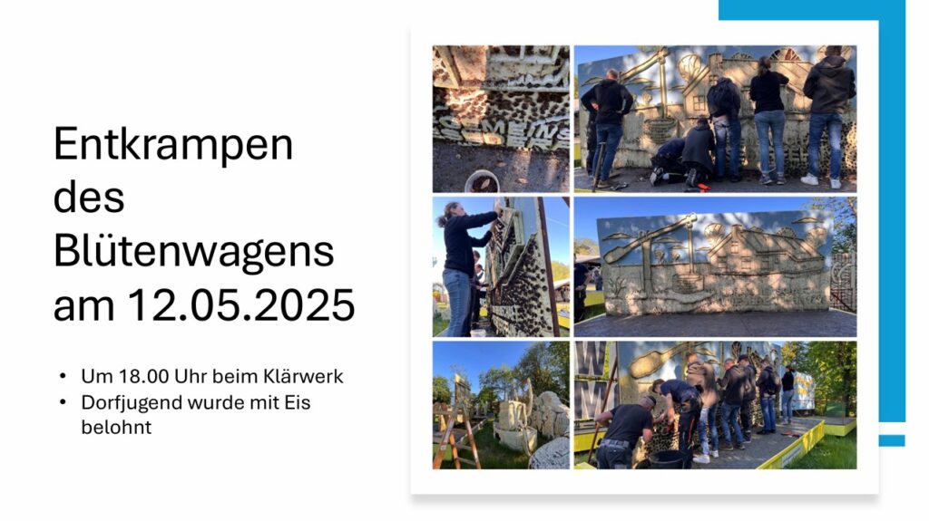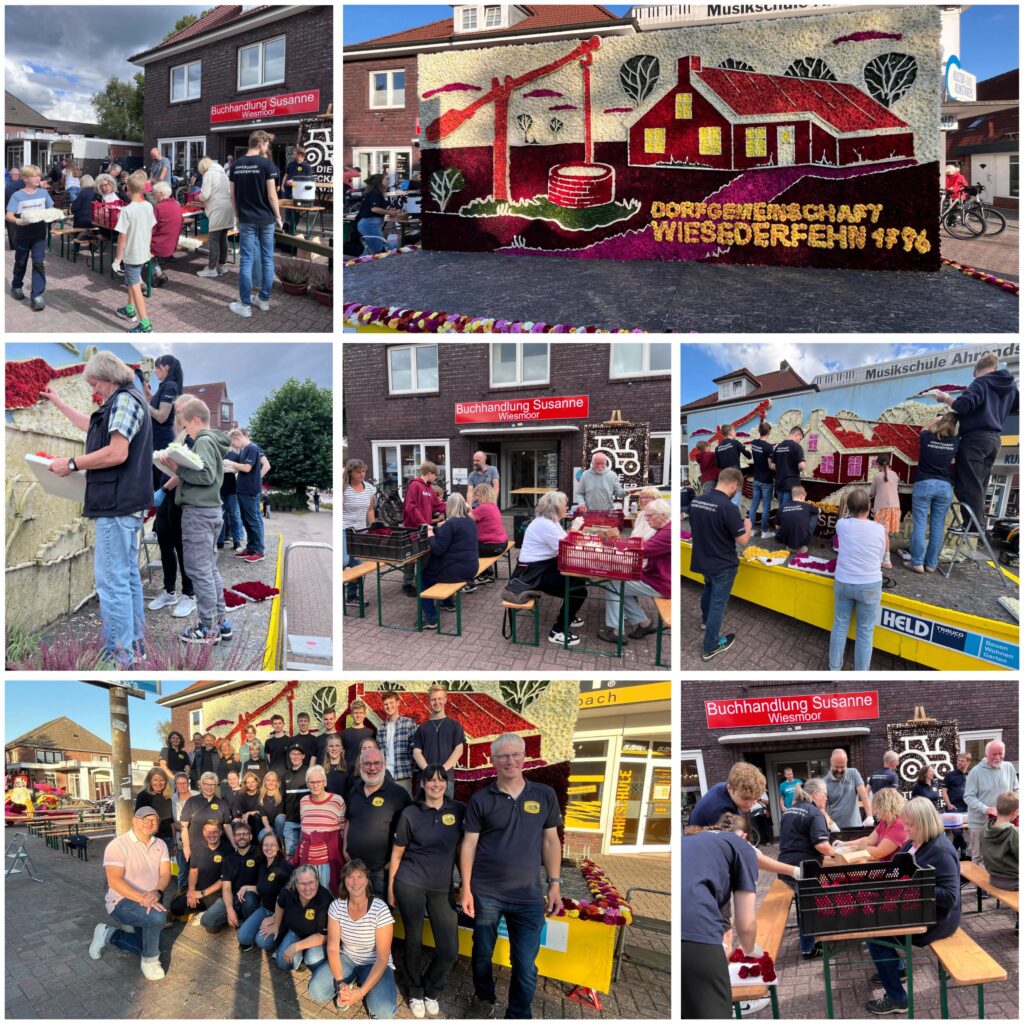 Über 50 Helfer*innen haben am 05.09.25 unseren wunderschönen Blütenwagen gesteckt. Bei schönstem Wetter und guter Laune ist am Ende ein Motiv voller leuchtender strahlender Blüten entstanden. Ein besonderer Dank gilt allen Mitwirkenden, die zu diesem tollen Nachmittag beigetragen haben.