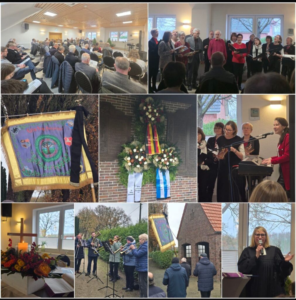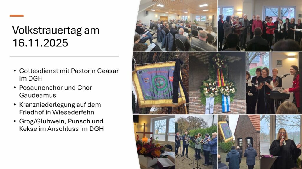 Zentraler Gottesdienst zum Volkstrauertag mit Pastorin Eva Caesar, dem Chor Gaudeamus unter Leitung von Silvia Sinning und dem Posaunenchor Hinrichsfehn/Wiesmoor unter Leitung von Dagmar Tuitjer. Eine gemeinschaftliche Veranstaltung von Dorfgemeinschaft Wiesederfehn e.V., KBV „Hier up an“ Wiesederfehn und Friedenskirche Wiesmoor.