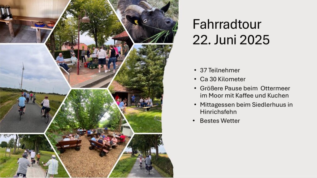 Am 22.06.25 fand unsere Fahrradtour bei schönstem Sonnenschein statt. Auf einer schönen Runde durch die umliegenden Dörfer gab es in den Pausen Kaffee/Tee und Kuchen, Kaltgetränke und andere Leckereien. Am Siedlerhus in Hinrichsfehn wurde später noch gegessen. Dank an alle Beteiligten für diesen tollen Sonntag.