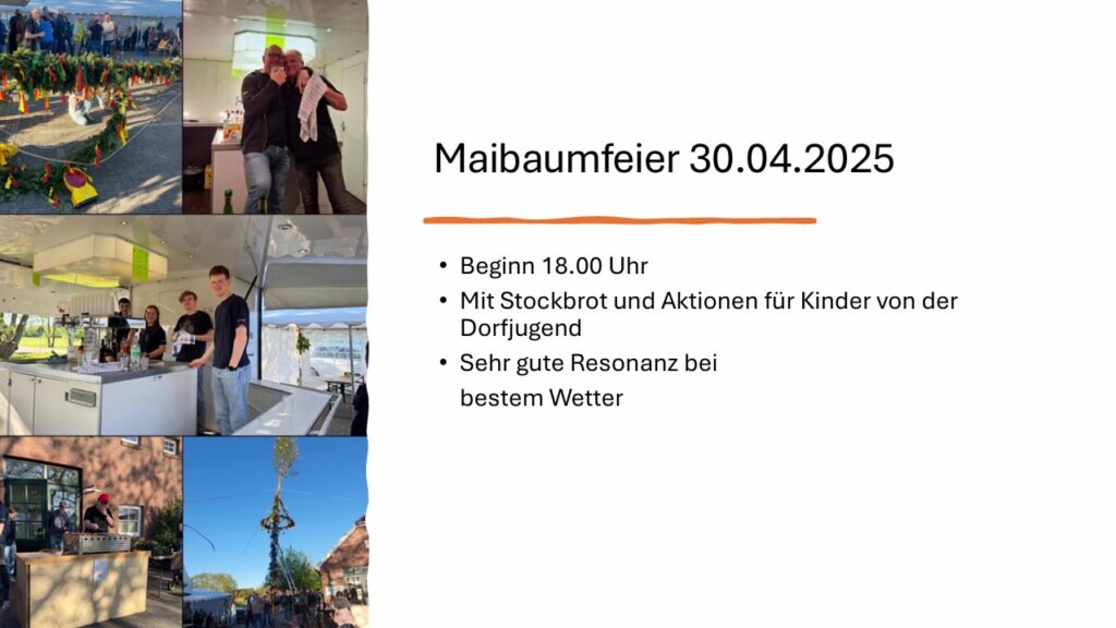 am 30.11.2025 haben wir den 1. Advent mit unserem beliebten Weihnachtsmarkt eingeläutet. Im DG Haus boten diverse Aussteller ihre Weihnachtsdekorationen an, beim Imker konnte hiesiger Honig gekauft werden und die Dorfjugend hat wieder ihre leckeren frisch gebackenen Waffeln angeboten. Draußen wurden Heißgetränke ausgeschenkt, der Duft von frisch Gegrilltem lag in der Luft. Für die Kleinen gab es am Nachmittag noch eine große Überraschung: der Weihnachtsmann kam mit einem Sack voller Geschenke. Den Bürgermeister und das Blütenkönigshaus konnten wir auch begrüßen. Es war ein toller Nachmittag. Danke an alle Besucher*innen, Helfer*innen und an das Orga-Team vom Vorstand – Ihr seid alle Spitze!