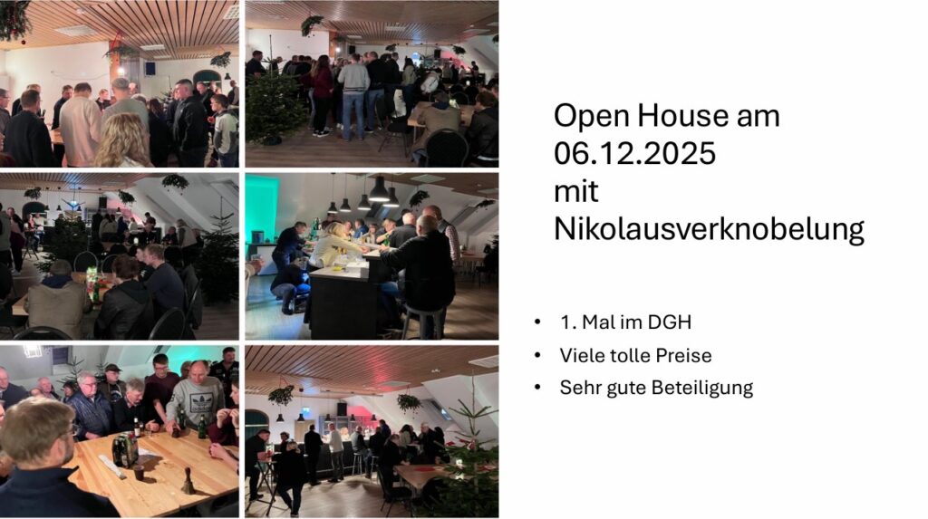 Am 06.12.2025 war unser 3. Open House mit Verknobelung ein voller Erfolg. Tolle Preise konnten erknobelt werden, u.a. der Hit des Abends: „Sixpack (Sechserträger Bier) mit Zusatzaal (Aal)“ abgeleitet von „sechs Richtige mit Zusatzzahl“.