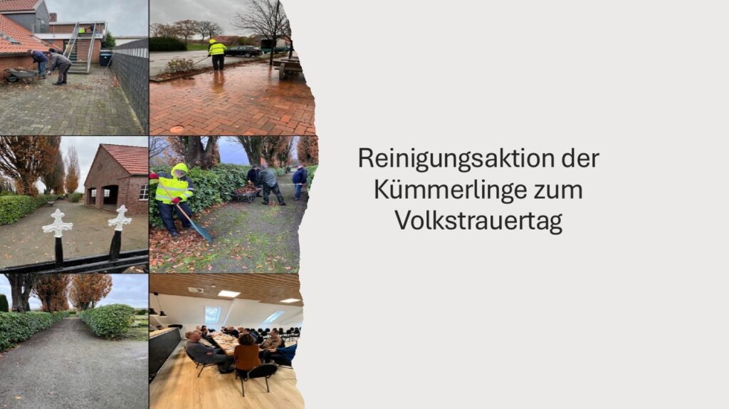 Zusammen mit dem Boßelverein „Hier up an“ haben wir am 15.11.25 unser Dorfgemeinschaftshaus für die Andacht zum Volkstrauertag vorbereitet. Auch auf dem Friedhof haben wir für die Kranzniederlegung ein wenig Hand angelegt. Anschließend gab es ein gemeinschaftliches Frühstück.